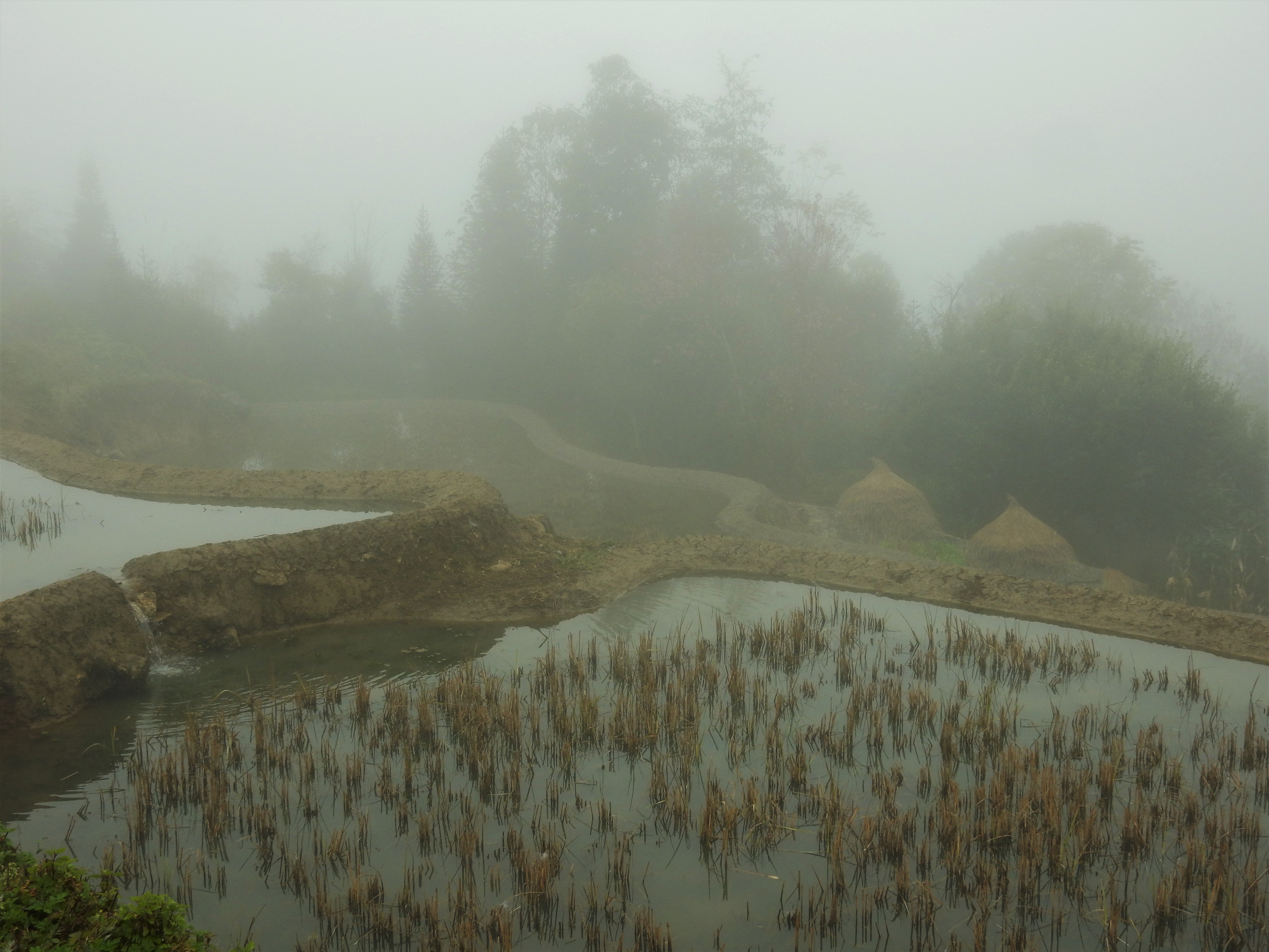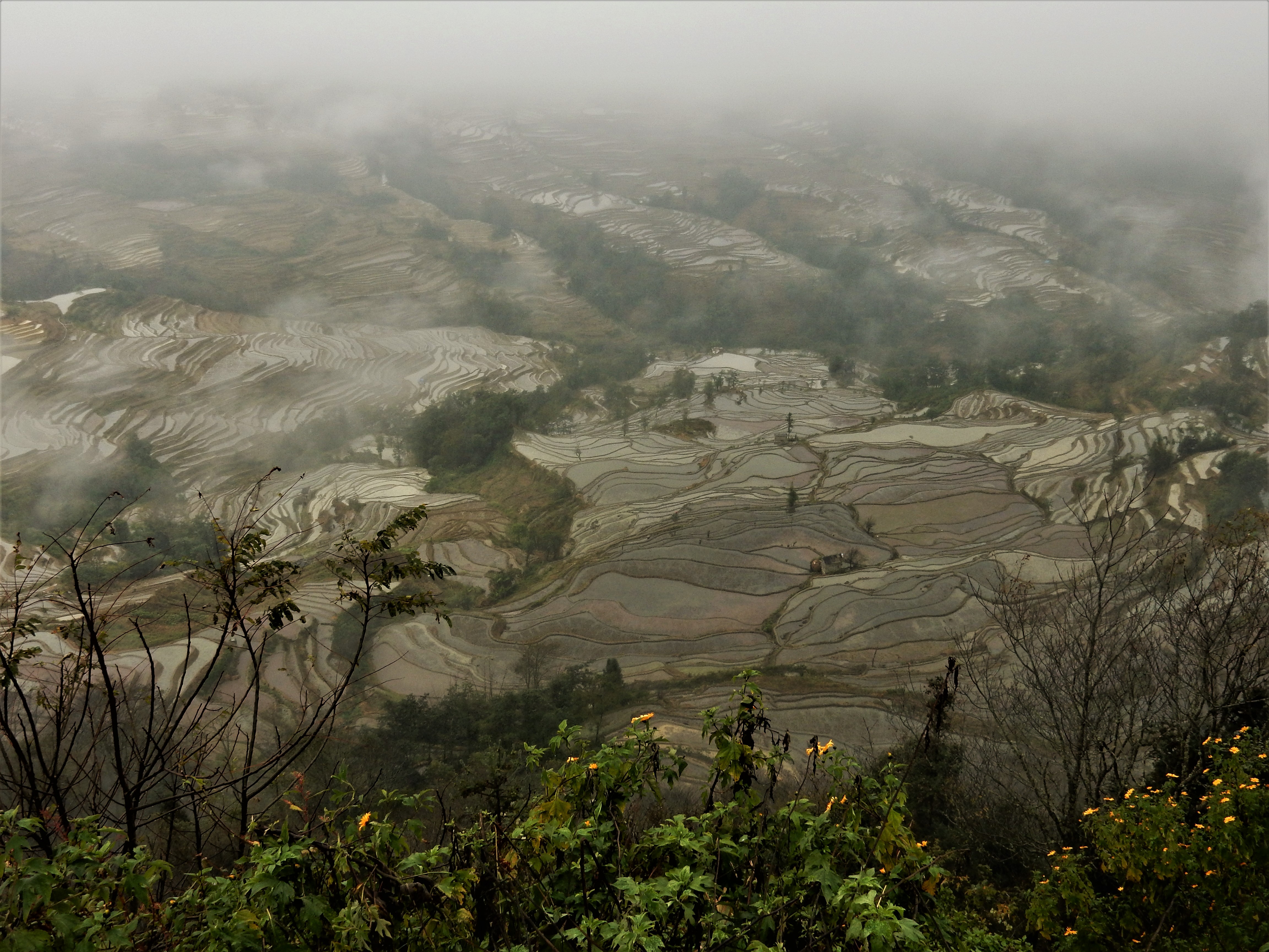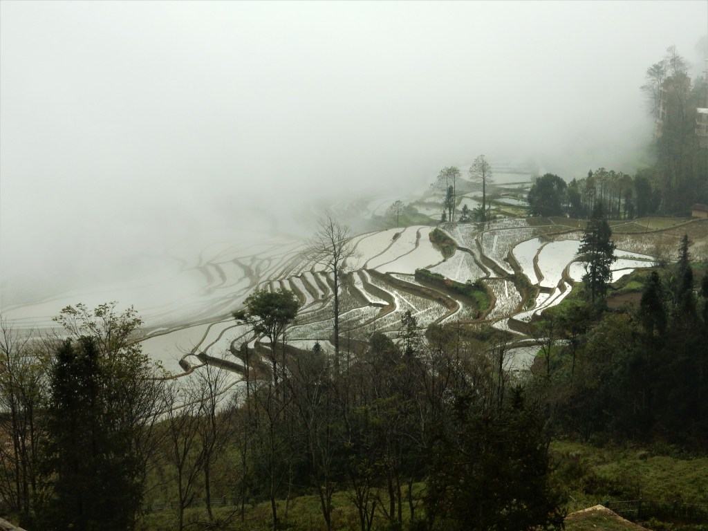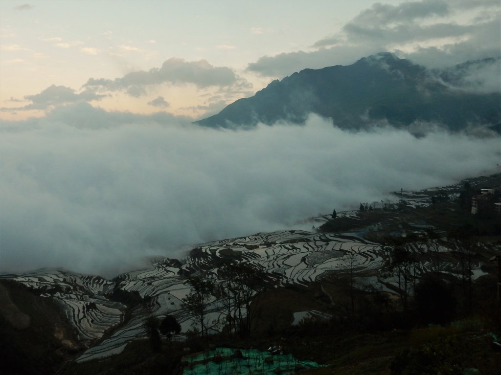Jacky’s Guesthouse in Yuanyang was right in the middle of a vast landscape of rice terraces and yet it was hard to see all of it. This was due to misty clouds that were literally rolling through the valley, only unveiling parts of the surrounding landscape at once. We set about on our trip and were soon soaked into a mysterious universe.
