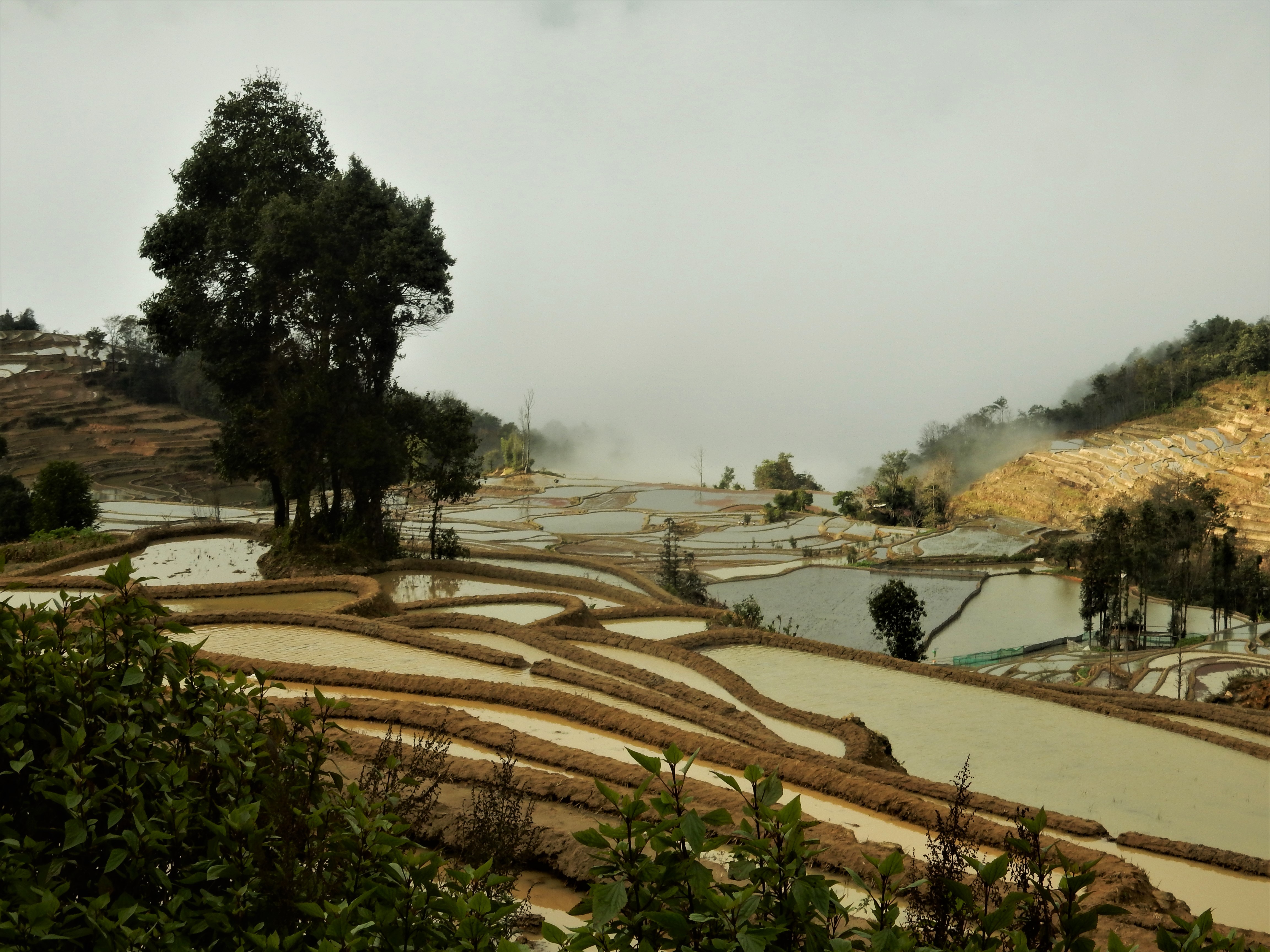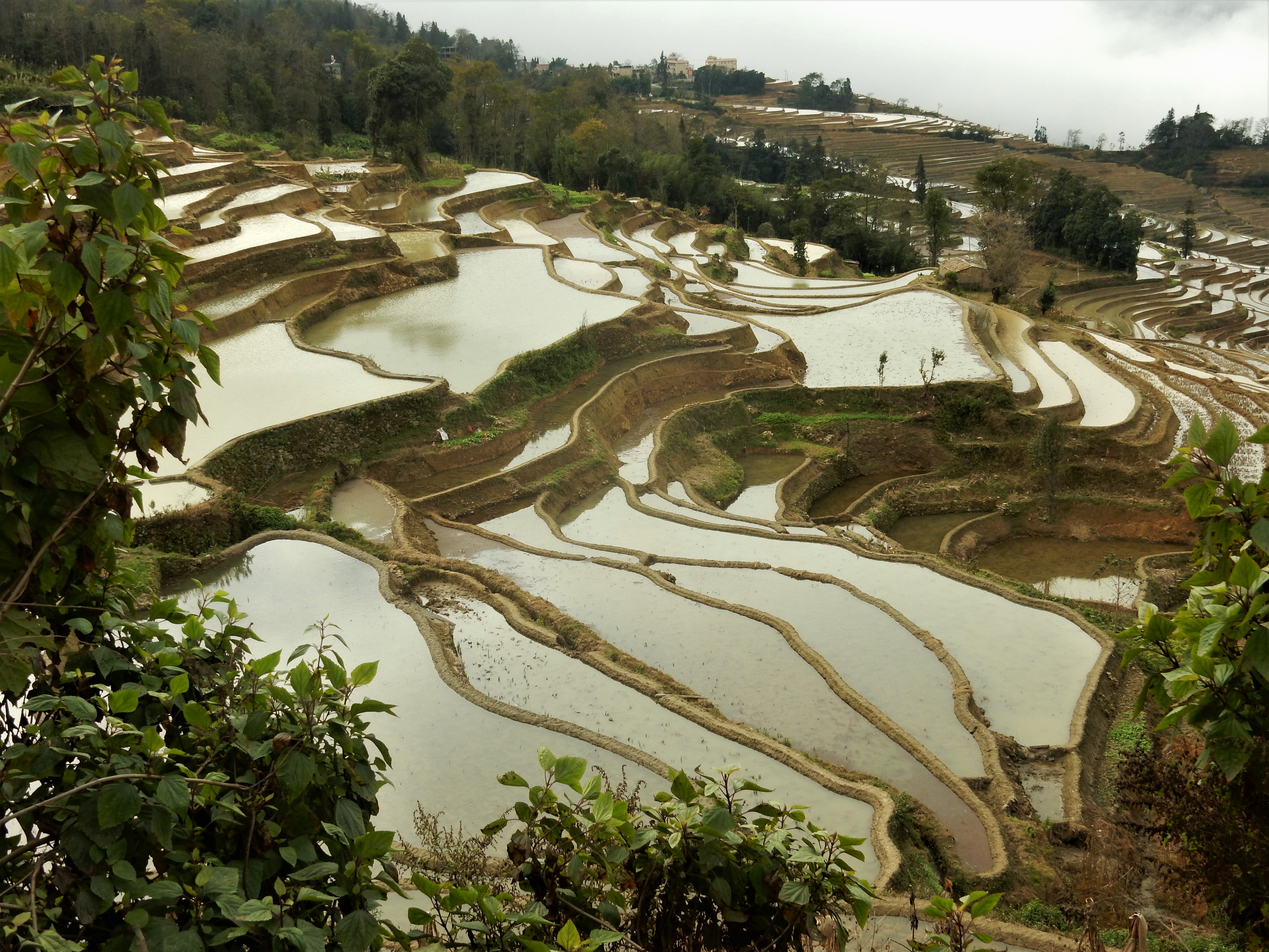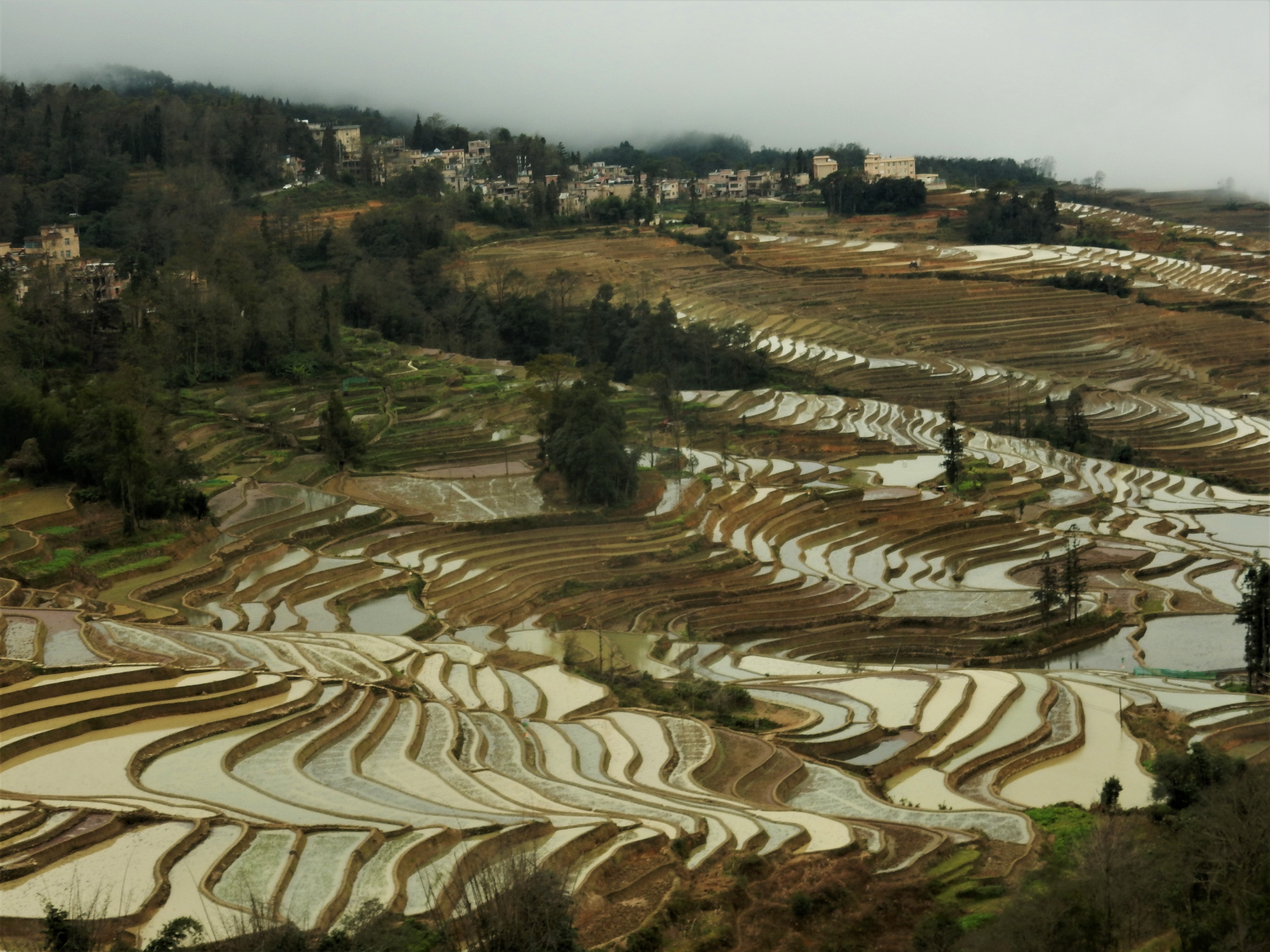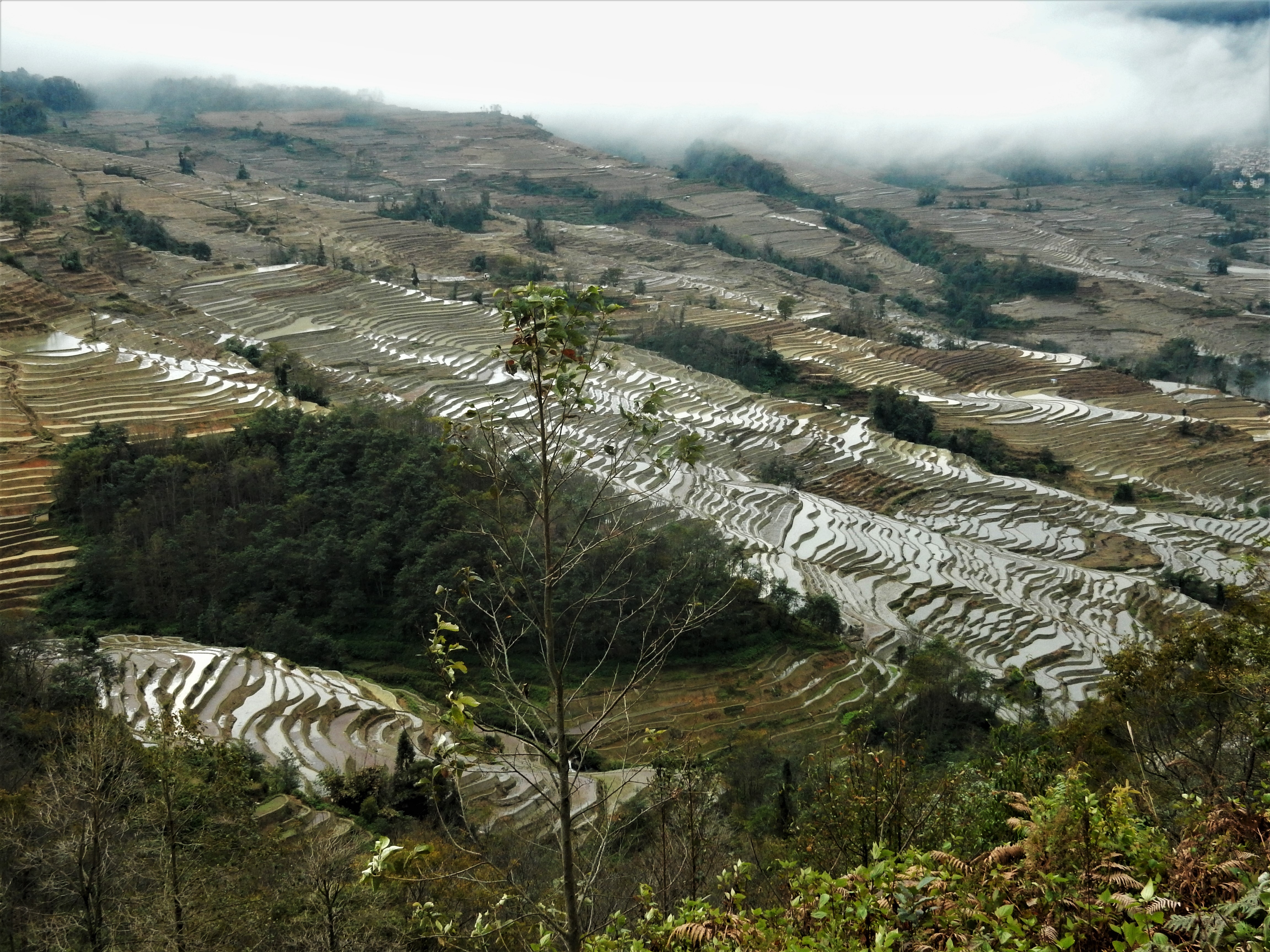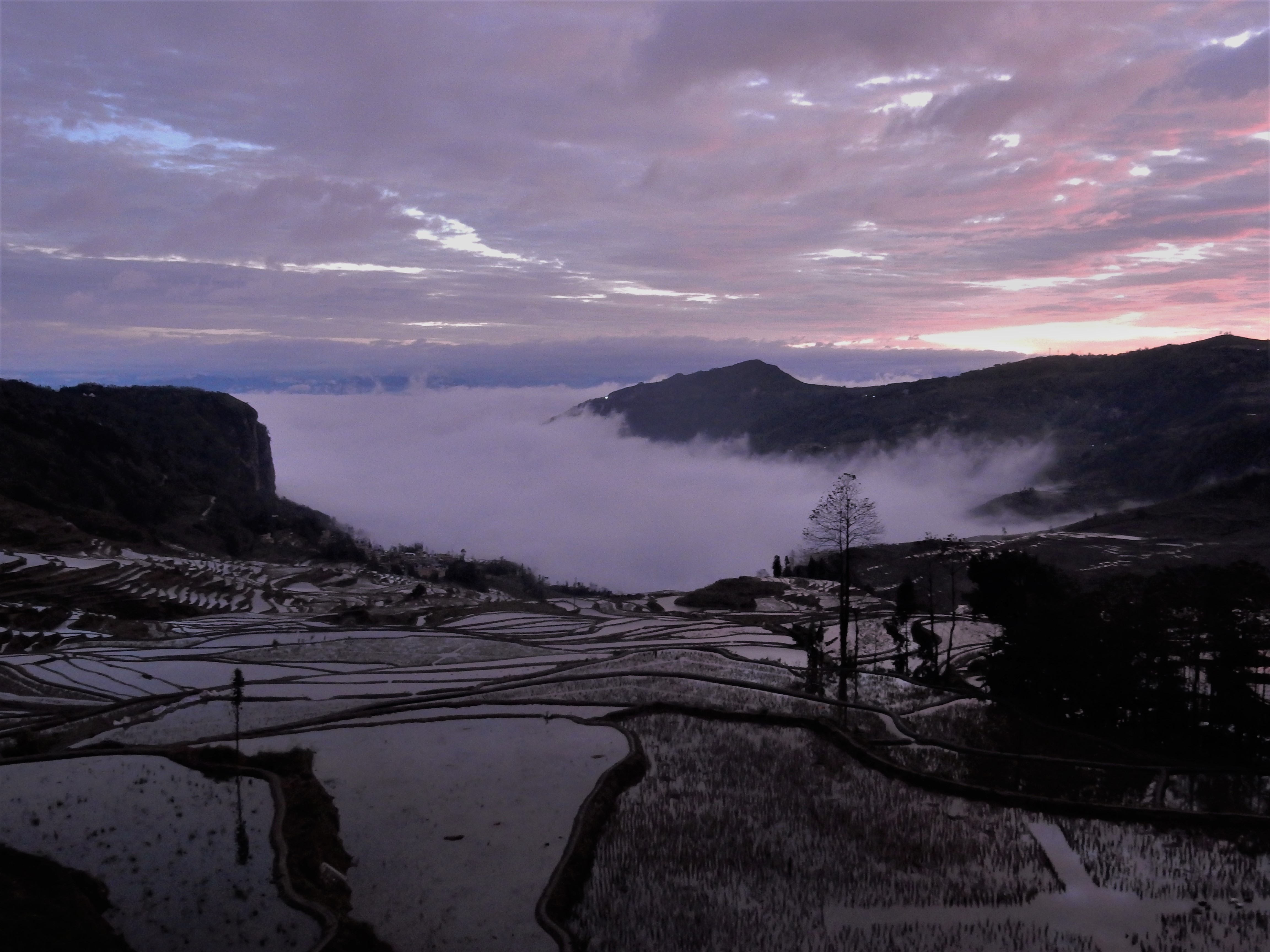 A detour on my way home, I could not pass up on visiting the Yuanyang rice terraces in Yunnan province, especially since December was perfect timing to see them filled with water. And so I took a bus in Kunming, the city that had gently welcomed me back in China after I had spent 3,5 months in Southeast Asia. As the bus neared its destination, I got acquainted with two young Americans who turned out to have booked at the same guesthouse and allowed me to team up with them for exploring the region the next day.